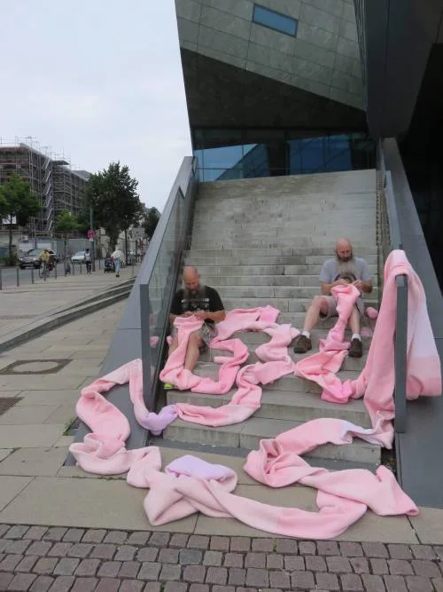 Stan Shellabarger and Dutes Miller will continue their 15 year performance project Untitled (Pink Tube) in DPAM’s galleries and public spaces. Untitled (pink tube) began in 2003 when Miller & Shellabrger created a chain of pink yarn into a circle. The artists simultaneously crochet opposite ends of a pink tube, poignantly exploring themes of intimacy, craft, labor, and gender through an ordinary gesture. The piece is performed always is in public and always together.